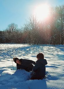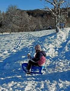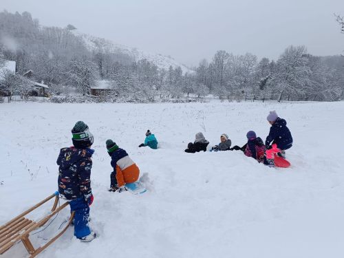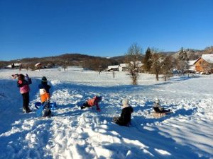Nakon ručka otišli smo na obližnje brdašce i maksimalno iskoristili dan bez oborina za uživanje u sanjkanju. Mirnu, snježnu seosku idilu uljepšali su dječji smijeh i vesela vriska.